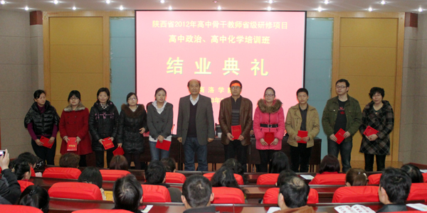 3月12日上午,我院承辦的陜西省2012年高中骨干教師省級(jí)研修項(xiàng)目高中政治、高中化學(xué)培訓(xùn)班舉辦了結(jié)業(yè)典禮。院長(zhǎng)、學(xué)院“國(guó)培計(jì)劃”和省級(jí)培訓(xùn)項(xiàng)目領(lǐng)導(dǎo)小組組長(zhǎng)張景書,副院長(zhǎng)、學(xué)院“國(guó)培計(jì)劃”和省級(jí)培訓(xùn)項(xiàng)目領(lǐng)導(dǎo)小組副組長(zhǎng)劉建林親臨結(jié)業(yè)典禮現(xiàn)場(chǎng),與學(xué)員們合影留念,并為學(xué)員們頒發(fā)證書。