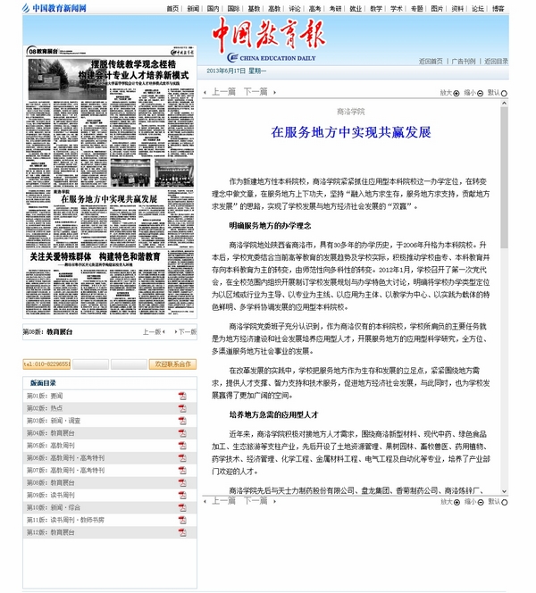 近年來,在全校師生員工的共同努力下,我校教學(xué)科研工作取得了長足的發(fā)展,教育教學(xué)成果豐碩、成就顯著,引起了社會各界的高度關(guān)注。6月17日,《中國教育報》刊登院長張景書署名文章《商洛學(xué)院:在服務(wù)地方中實(shí)現(xiàn)共贏發(fā)展》,全面介紹了我校立足地方、服務(wù)地方,在建設(shè)特色鮮明、多學(xué)科協(xié)調(diào)發(fā)展的應(yīng)用型普通本科院校歷程中所做的工作和取得的成績。