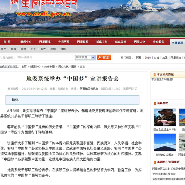 根據(jù)安排,蔣正治還將在阿里地區(qū)老干局、阿里地區(qū)公安處、阿里軍分區(qū)等單位宣講“中國夢”。