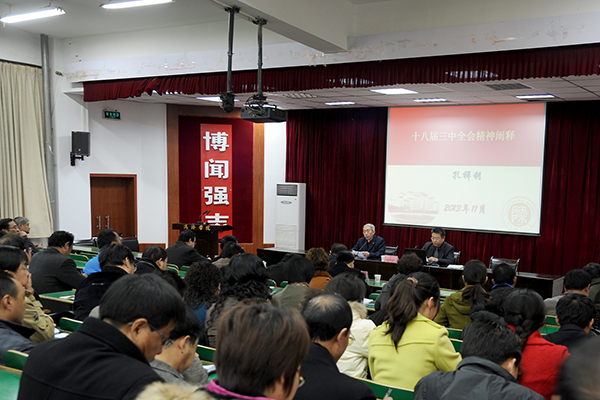 為了幫助我校師生全面、準(zhǔn)確、深入學(xué)習(xí)和理解黨的十八屆三中全會(huì)精神,12月2日,宣傳部、干部人事處聯(lián)合邀請(qǐng)陜西省委宣傳部、高教工委教授宣講團(tuán)成員,陜西師范大學(xué)宣傳部長(zhǎng)、博士生導(dǎo)師孔祥利教授作了專題報(bào)告。校領(lǐng)導(dǎo)張景書、左曉民、王思懷、魏書堂,全體科級(jí)以上干部、兩級(jí)中心學(xué)習(xí)組成員、思想政治理論課教師、輔導(dǎo)員、“青馬工程”學(xué)員和學(xué)生干部代表聽取了報(bào)告。報(bào)告會(huì)由黨委副書記左曉民主持。