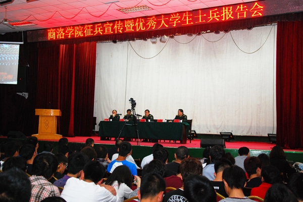 青春獻(xiàn)國防,建功在軍營。為促進(jìn)我校學(xué)生對大學(xué)生參軍入伍相關(guān)政策和知識(shí)的了解,鼓勵(lì)青年大學(xué)生投身國防建設(shè),5月7日,我校召開2014年征集大學(xué)生士兵政策宣講暨優(yōu)秀大學(xué)生軍人事跡報(bào)告會(huì)。校黨委副書記左曉民、商洛軍分區(qū)政委張永忠、商州區(qū)武裝部政委張翔、副部長劉永凱、商洛軍分區(qū)征兵辦公室科長沈禮軍出席會(huì)議,全體輔導(dǎo)員及學(xué)生代表400余人參加了會(huì)議。會(huì)議由商州區(qū)武裝部政委張翔主持。