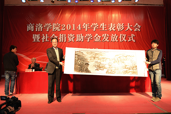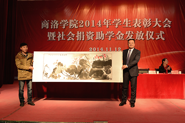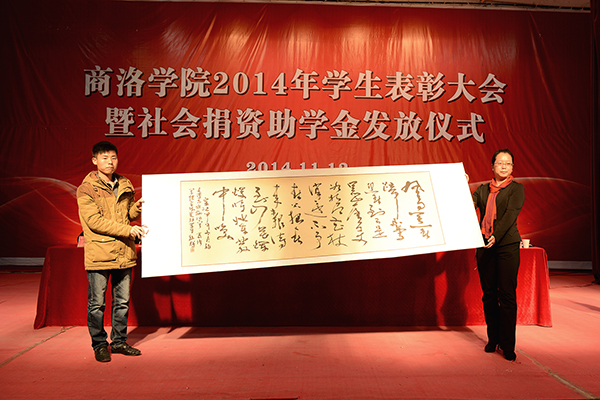 為了答謝4家企業(yè)對(duì)我校學(xué)生的無(wú)私資助,受助學(xué)生代表現(xiàn)場(chǎng)向商洛供電局、中國(guó)郵政商洛分公司、中國(guó)聯(lián)通商洛分公司和中國(guó)電信商洛分公司敬贈(zèng)了4幅自己創(chuàng)作的書(shū)畫(huà)作品。學(xué)生王聰、張思思分別代表受表彰的先進(jìn)個(gè)人和受資助學(xué)生作了大會(huì)發(fā)言。