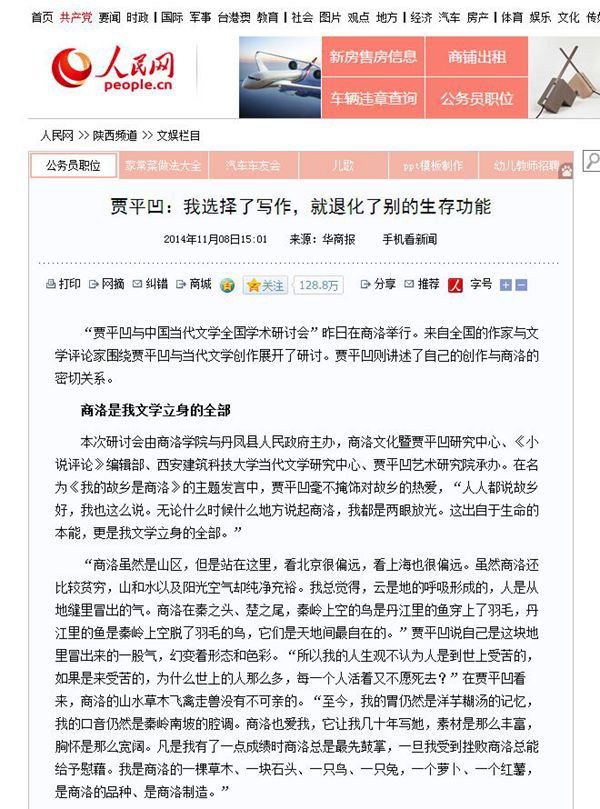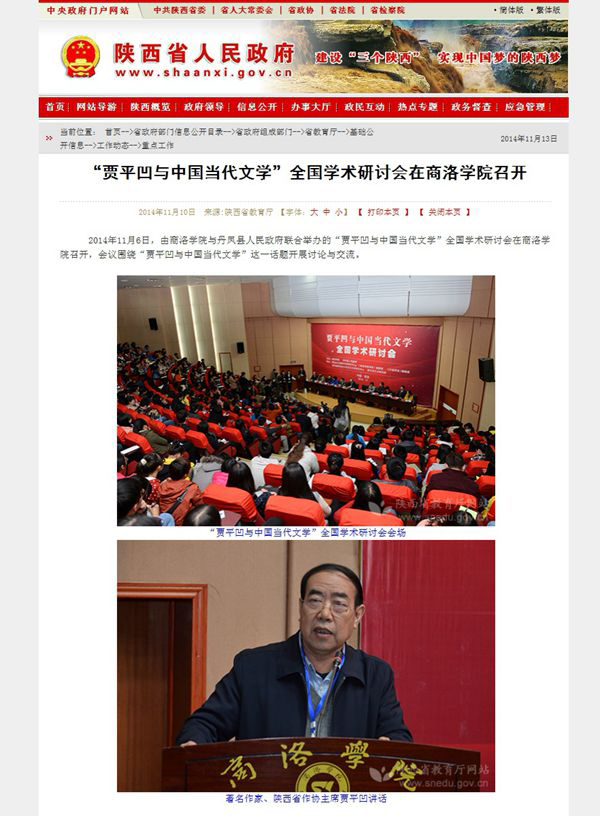 陜西廣播電視臺:11月8日陜西一套《第一新聞(午間播報)》欄目http://www.snrtv.com/content/2014-11/08/content_11808462.htm#(點擊該網(wǎng)絡(luò)鏈接,查找該頁面下方第13個新聞視頻《“賈平凹與中國當(dāng)代文化”全國學(xué)術(shù)研討會在商洛召開》)