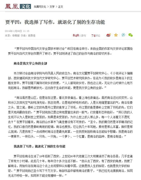 三秦網(wǎng):《近百學(xué)者商洛研討“賈平凹與中國當(dāng)代文學(xué)”》