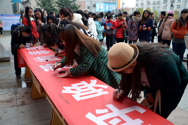 三五塊、十多塊、數(shù)百塊,都承載著師生們對(duì)王珍琪的鼓舞與祝福匯聚到募捐箱中。師生們還紛紛在活動(dòng)橫幅上寫下了“樹(shù)立信心,堅(jiān)強(qiáng)面對(duì)”“戰(zhàn)勝病魔,早日康復(fù)”等一句句祝福的話語(yǔ)。一時(shí)間,愛(ài)的暖流匯聚整個(gè)校園。