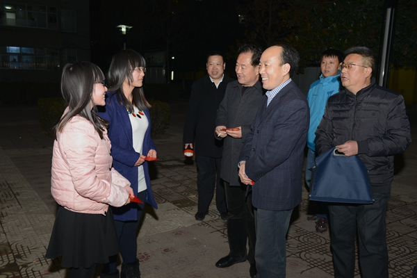 在學(xué)校辦公室、保衛(wèi)處、后勤保障處負(fù)責(zé)人的陪同下,彭虎軍先后前往各處門衛(wèi)、教學(xué)樓、公寓、圖書館、體育場(chǎng)值班室,后勤保障處公寓服務(wù)中心、水電班,保衛(wèi)處警務(wù)室、監(jiān)控室等一線崗位,與工作人員親切握手,代表學(xué)校黨政向大家拜年,對(duì)堅(jiān)守在工作崗位上的工作人員表示感謝,并親手送上節(jié)日慰問品。在慰問中,彭虎軍詳細(xì)詢問了各部門的工作情況,要求每位工作人員在春節(jié)期間一定要把安全穩(wěn)定放在首位,保證在校師生度過一個(gè)溫暖、祥和的春節(jié)。