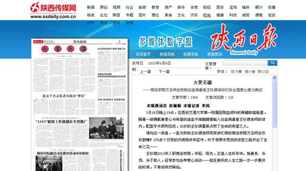 4月9日,《陜西日報》第5版頭條以《大愛無疆》為題,對我校踐行社會主義核心價值觀救助患白血病教師王珍琪,引發(fā)全國愛心接力活動進(jìn)行了報道。