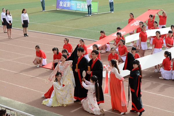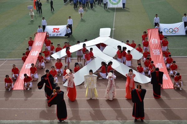 開(kāi)幕式上,由西安理工大學(xué)、我校電子信息與電氣工程學(xué)院和城鄉(xiāng)規(guī)劃與建筑工程學(xué)院組成的航模隊(duì)以精彩的航模飛行表演拉開(kāi)了本次大型文體表演的序幕,飛機(jī)模型帶著“預(yù)祝運(yùn)動(dòng)會(huì)圓滿成功”的祝福橫幅飛上藍(lán)天;生物醫(yī)藥與食品工程學(xué)院的團(tuán)體操《環(huán)舞青春,再創(chuàng)輝煌》激情四射,活力十足,擺出“2006”和“2015”的字樣,分別表示我校2006年專(zhuān)升本和2015年迎接教育部本科教學(xué)工作合格評(píng)估的兩個(gè)重要轉(zhuǎn)折點(diǎn);人文社會(huì)科學(xué)學(xué)院的太極拳表演《舞動(dòng)太極》剛?cè)嵯酀?jì),典雅大方,凝聚了傳統(tǒng)文化的精髓;電子信息與電氣工程學(xué)院的軍體拳表演《青春風(fēng)采》動(dòng)作整齊劃一,氣勢(shì)恢弘,40人擒拿氣勢(shì)威武,充滿陽(yáng)剛之氣,雙截棍表演動(dòng)如雷霆,酷炫無(wú)敵,由320人擺出院徽“義”字,寓意他們?cè)趯W(xué)業(yè)上不斷向上,勇攀高峰,像海鷗般展翅飛翔,擁抱陽(yáng)光,走向明天的輝煌;化學(xué)工程與現(xiàn)代材料學(xué)院的團(tuán)體表演《揚(yáng)帆起航》青春陽(yáng)光,激情飛揚(yáng),用男子漢的力量和激情為整場(chǎng)表演畫(huà)上了圓滿的句號(hào)。