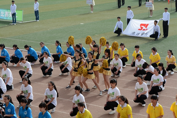在歡快的運(yùn)動(dòng)會(huì)進(jìn)行曲中,各院和教職工代表等方隊(duì)精神飽滿,依次入場(chǎng)。他們昂首闊步,精神抖擻,整齊的陣容,嘹亮的口號(hào),颯爽的英姿,展示了當(dāng)代師生意氣風(fēng)發(fā)、朝氣蓬勃的青春風(fēng)采,博得了全場(chǎng)的陣陣掌聲。語(yǔ)言文化傳播學(xué)院擺出了漢字“文”的隊(duì)形,生物醫(yī)藥與食品工程學(xué)院用雙手組成“海鷗”圖形,城鄉(xiāng)規(guī)劃與建筑工程學(xué)院用五彩扇子組成“JGXY(建工學(xué)院)”、笑臉、“Go”三個(gè)圖案,其他各院也紛紛以多種多樣的形式展示了昂揚(yáng)的精神風(fēng)貌。