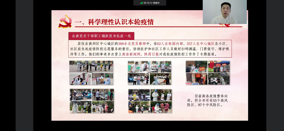 黨委書記張志昌在授課中指出,自疫情發(fā)生以來,學(xué)校深入貫徹落實(shí)習(xí)近平總書記關(guān)于疫情防控工作的重要指示精神以及屬地疫情防控工作要求,迅速啟動(dòng)防控預(yù)案,科學(xué)防控,有力維護(hù)了校園安全穩(wěn)定大局和師生生命安全健康。