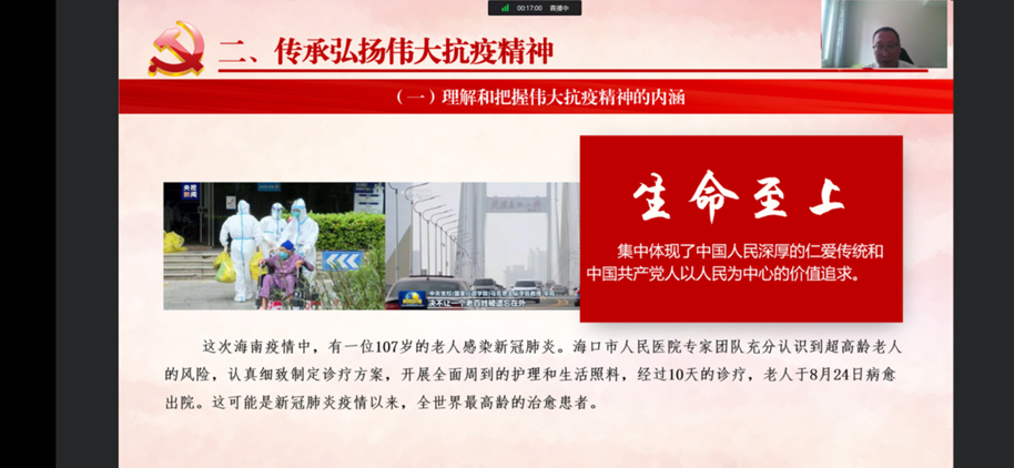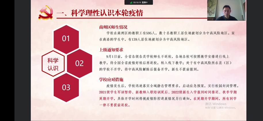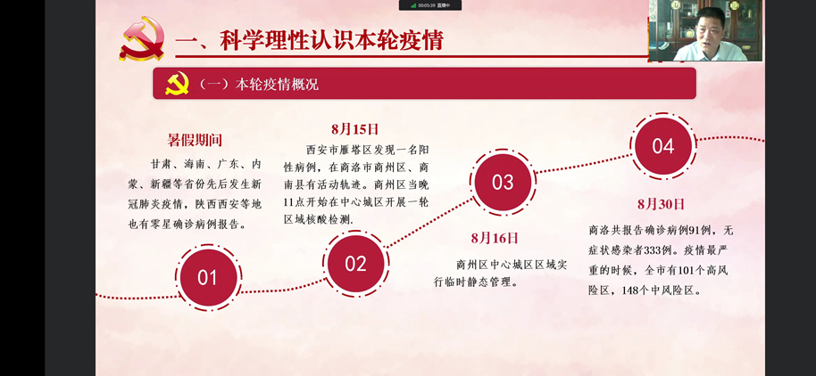 本次“開學(xué)第一課”以“弘揚(yáng)偉大抗疫精神 喜迎黨的二十大召開”為主題。校領(lǐng)導(dǎo)們圍繞“科學(xué)理性認(rèn)識(shí)本輪疫情;傳承弘揚(yáng)偉大抗疫精神;學(xué)習(xí)貫徹習(xí)近平總書記重要講話精神、以實(shí)際行動(dòng)迎接黨的二十大召開”等方面,通報(bào)了學(xué)校疫情防控工作階段性成果,以生動(dòng)鮮活的事例深入闡釋了偉大抗疫精神的豐富內(nèi)涵;號(hào)召全校師生堅(jiān)定不移貫徹“動(dòng)態(tài)清零”總方針,從我做起嚴(yán)格遵守疫情防控各項(xiàng)要求;鼓勵(lì)廣大青年學(xué)生在攜手同心戰(zhàn)疫情的同時(shí),深入學(xué)習(xí)習(xí)近平總書記重要講話精神,用實(shí)際行動(dòng)迎接黨的二十大召開。