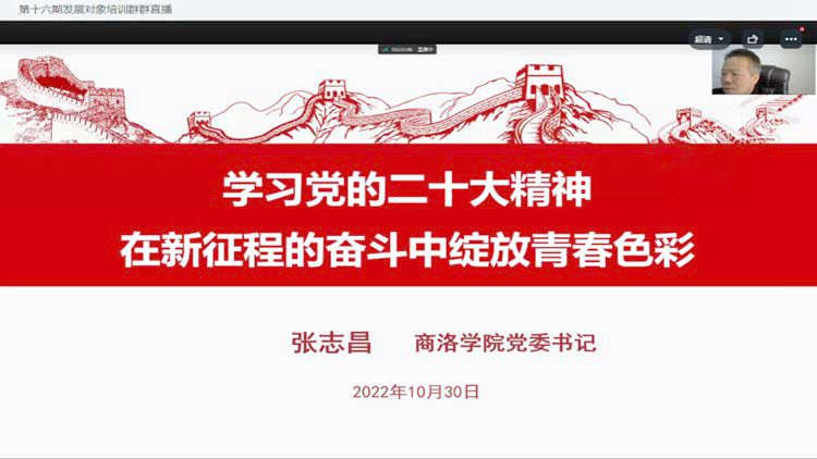 為深入學(xué)習(xí)貫徹黨的二十大精神,切實(shí)做好黨員發(fā)展工作,嚴(yán)格把好發(fā)展黨員“入口關(guān)”,強(qiáng)化發(fā)展對象的黨性意識,保證黨員發(fā)展質(zhì)量,10月30日至11月7日,我校組織開展了第十六期黨員發(fā)展對象培訓(xùn)活動(dòng)。校黨委書記張志昌、黨委副書記彭虎軍先后在線為本期發(fā)展對象作專題輔導(dǎo)報(bào)告。