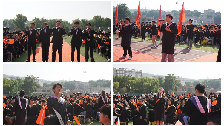 藝術學院師生為畢業(yè)生表演了《追夢赤子心》等富有青春熱情、飽含留戀不舍的暖場歌曲。