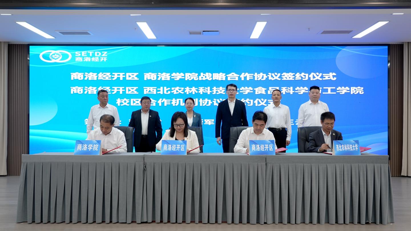 為推動校區(qū)合作和產(chǎn)學(xué)研深度融合,提升商洛經(jīng)濟技術(shù)開發(fā)區(qū)科技創(chuàng)新與經(jīng)濟發(fā)展效能,9月29日,商洛經(jīng)開區(qū)校區(qū)合作共建食品產(chǎn)業(yè)園簽字儀式在商洛市舉行。商洛市委副書記、商洛經(jīng)開區(qū)黨工委書記趙孝,洛南縣委書記楊長江,校長權(quán)雅寧、副校長王新軍出席簽約儀式。趙孝、權(quán)雅寧共同為“商洛學(xué)院陜西省大學(xué)科技園綠色食品產(chǎn)學(xué)研示范基地”和“商洛學(xué)院電商直播實踐教學(xué)基地”揭牌。王新軍代表學(xué)校和商洛經(jīng)開區(qū)黨工委副書記蔣金君簽署戰(zhàn)略合作協(xié)議。簽約儀式由商洛經(jīng)開區(qū)管委會主任彭書旺主持。