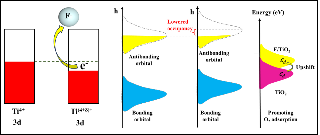 該研究指出,金屬的d帶能級高低決定了催化劑表面活性位點對小分子物質(zhì)的吸附強度,能級越高,催化劑對小分子物質(zhì)的吸附能力越強。該研究通過F摻雜提升TiO2的d帶中心,提高了TiO2對O2的吸附性能,從而增強了TiO2光催化產(chǎn)H2O2的活性。