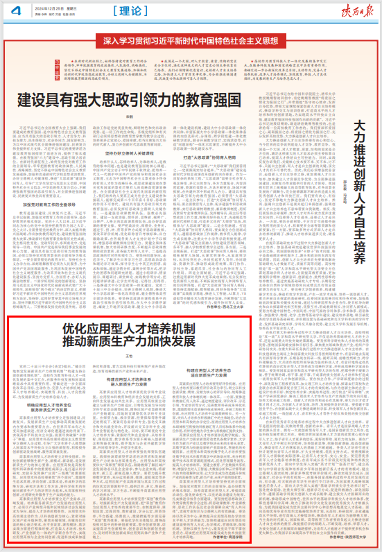 12月25日,《陜西日報》“理論”版面刊發(fā)了我校王怡教授以《優(yōu)化應用型人才培養(yǎng)機制 推動新質(zhì)生產(chǎn)力加快發(fā)展》為題的署名文章,文章結(jié)合我校辦學實際和校地協(xié)同發(fā)展經(jīng)驗,深入剖析了高校在教育科技人才一體化發(fā)展背景下,如何培養(yǎng)高素質(zhì)應用型人才,為新質(zhì)生產(chǎn)力加快發(fā)展貢獻更多力量。