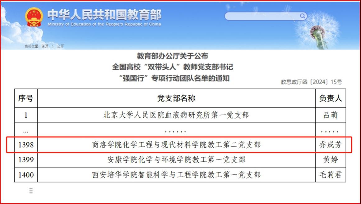 化材學院教工第二黨支部入選全國“雙帶頭人”教師黨支部書記“強國行”專項行動團隊