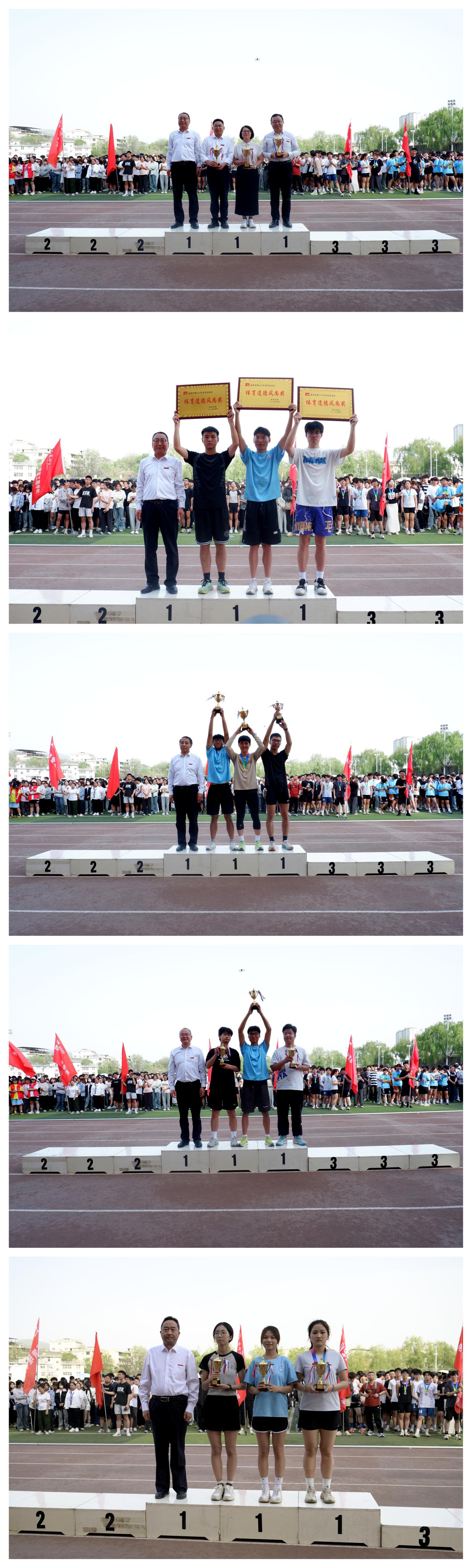 在熱烈的掌聲中,劉寶盈分別為獲得教工組團(tuán)體總分前三名和體育道德風(fēng)尚獎(jiǎng)的學(xué)院頒獎(jiǎng),王新軍為團(tuán)體總分前三名頒獎(jiǎng),郭瑾為男子團(tuán)體總分前三名頒獎(jiǎng),張向東為女子團(tuán)體總分前三名頒獎(jiǎng)。