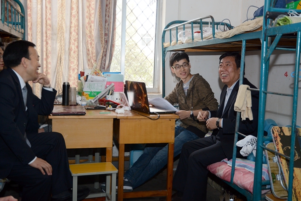 在彭虎軍和學校辦公室、保衛(wèi)處、后勤保障處相關(guān)負責人的陪同下,張玉明深入我校食堂、公寓和監(jiān)控中心視察。每到一處,張玉明都詳細了解相關(guān)安全制度及落實情況,仔細檢查安全設施的維護保養(yǎng)狀況,并和學生進行了現(xiàn)場交流,傾聽他們的意見和建議。在學生食堂,張玉明仔細檢查了操作間的衛(wèi)生條件、飯菜樣本,詢問了解飯菜品種、價格情況,嚴格要求食堂工作人員把好食品安全關(guān)。在學生公寓,張玉明認真檢查了公寓管理日志,詳細了解公寓安全管理各項制度的執(zhí)行落實情況,并在宿舍里向?qū)W生詢問了對學校各項工作的意見。