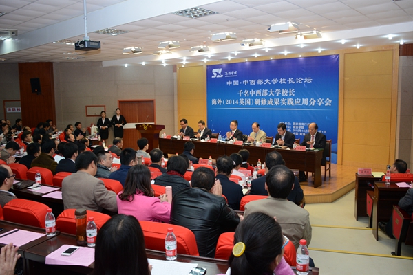 10月31日,由國家教育行政學(xué)院主辦、我校承辦的“中國?中西部大學(xué)校長(zhǎng)論壇——千名中西部大學(xué)校長(zhǎng)海外(2014英國)研修成果實(shí)踐應(yīng)用分享會(huì)”在我校召開。來自全國20余所中西部大學(xué)的40余位書記、校長(zhǎng)、專家齊聚我校,共同探討交流應(yīng)用型本科院校建設(shè)等有關(guān)問題。教育部港澳臺(tái)辦常務(wù)副主任趙靈山、國家教育行政學(xué)院涉外培訓(xùn)部主任樊平軍、陜西省委高教工委常務(wù)副書記董小龍,商洛市委常委、副市長(zhǎng)武文罡出席會(huì)議并講話。校黨委書記、校長(zhǎng)劉建林在開幕式上作了致辭。論壇開幕式由湖南科技學(xué)院黨委書記陳弘主持。