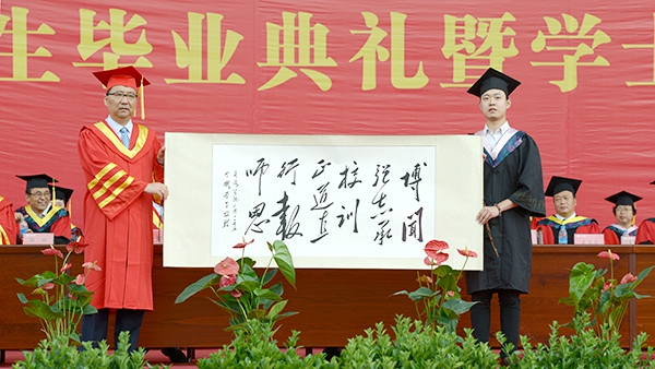 為了感謝母校的培育之恩,2017屆畢業(yè)生向我校贈送書法作品“博聞強志承校訓,正道直行報師恩”作為永久的紀念。黨委書記龍治剛代表學校接受作品。