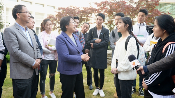 報(bào)告一結(jié)束,師生們便圍到陳俊身邊進(jìn)行交流。她說,國家高度重視高等教育發(fā)展和青年人才培養(yǎng),學(xué)校要做好做強(qiáng)“四個(gè)一流”建設(shè),結(jié)合專業(yè)優(yōu)勢和商洛特色產(chǎn)業(yè)尋求突破,提高人才培養(yǎng)質(zhì)量,培養(yǎng)更多社會(huì)主義接班人。她對(duì)教師深入商洛貧困地區(qū)開展根植地方行動(dòng)計(jì)劃、精準(zhǔn)扶貧的做法予以充分肯定,寄語教師要關(guān)心和愛護(hù)學(xué)生,以教書育人為己任,將崇教厚德、為人師表統(tǒng)一起來,將學(xué)術(shù)力量和人格魅力統(tǒng)一起來,將社會(huì)需求和科學(xué)研究結(jié)合起來,以高尚師德和廣博學(xué)識(shí)贏得學(xué)生愛戴和社會(huì)尊敬,成為大學(xué)生可親可敬、可學(xué)可仿的良師益友。希望廣大青年學(xué)子在十九大精神鼓舞下,珍惜美好時(shí)光,刻苦努力學(xué)習(xí),和時(shí)代同步,與優(yōu)秀同行,踏踏實(shí)實(shí)學(xué)好本領(lǐng),找準(zhǔn)目標(biāo)方向,堅(jiān)韌不拔,持之以恒,在社會(huì)實(shí)踐中放飛青春夢(mèng)想,譜寫壯麗人生之歌,為實(shí)現(xiàn)中華民族偉大復(fù)興的中國夢(mèng)不懈奮斗!