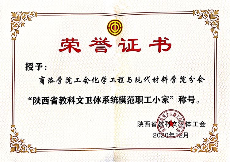 近日,陜西省教科文衛(wèi)體工會(huì)委員會(huì)發(fā)布了《關(guān)于表彰陜西省教科文衛(wèi)體系統(tǒng)模范職工之家、模范職工小家、優(yōu)秀工會(huì)工作者、優(yōu)秀工會(huì)積極分子、優(yōu)秀工會(huì)之友的通報(bào)》(陜教科文衛(wèi)體工字[2020]46號(hào)),校工會(huì)化材學(xué)院分會(huì)被授予陜西省科教文衛(wèi)體系統(tǒng)“模范職工小家”榮譽(yù)稱(chēng)號(hào)。