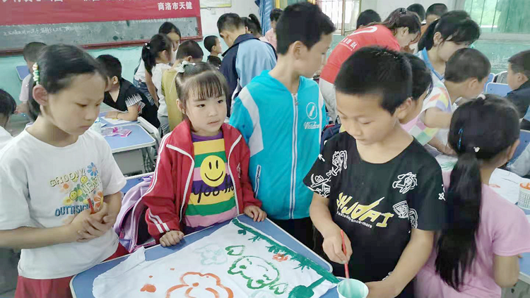 活動中,師生為該校留守兒童贈送了圖畫本、鉛筆、橡皮等繪畫用品。向小朋友們展示了校藝術(shù)學院學生制作的泥塑、石頭畫、剪紙拼畫、電腦繪畫等美術(shù)作品,拓展了小朋友們的審美視野,增強了大家的邏輯思維與形象思維能力,激發(fā)了大家熱愛美、發(fā)現(xiàn)美、追求美的熱情。師生還進行了“T恤衫彩繪”現(xiàn)場學創(chuàng)實踐,用美術(shù)實踐與T恤衫繪畫相結(jié)合的教學方式,鼓勵和引導小朋友們嘗試多樣思維和多元表現(xiàn),進一步增強了大家的實踐創(chuàng)作能力。在我校師生一對一、手把手的耐心講解與悉心指導下,每個小朋友都獨立完成了精美的美術(shù)作品。
