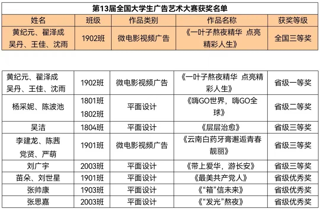 本屆大賽開辟了微電影廣告視頻類新賽道,由藝術學院教師楊靜指導的微電影廣告視頻類作品《一葉子熬夜精華點亮精彩人生》獲得國家級三等獎和省級一等獎、《云南白藥牙膏邂逅青春靚麗》獲得省級三等獎;在平面設計類賽道中,藝術學院教師王曦茜指導的《嗨GO世界,嗨GO全球》獲得省級二等獎,教師王子瑋指導的《層層治愈》榮獲省級三等獎,教師楊靜指導的《帶上愛華游長安》榮獲省級三等獎、《最美共產黨人》獲得省級優(yōu)秀獎,教師張中義指導的《“發(fā)光”熬夜》、教師余鑫指導的《“箱”信未來》獲得省級優(yōu)秀獎。