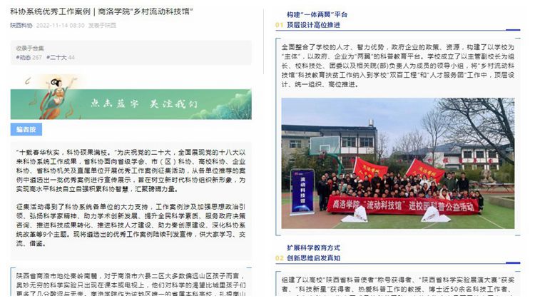 為慶祝黨的二十大勝利召開(kāi),全面展現(xiàn)黨的十八大以來(lái)科協(xié)系統(tǒng)工作成果,陜西省科協(xié)面向省級(jí)學(xué)會(huì)、市(區(qū))科協(xié)、高校科協(xié)、企業(yè)科協(xié)、省科協(xié)機(jī)關(guān)及直屬單位開(kāi)展優(yōu)秀工作案例征集活動(dòng),遴選出一批科協(xié)系統(tǒng)優(yōu)秀工作案例,在陜西科協(xié)微信公眾號(hào)向全社會(huì)展示。我校“鄉(xiāng)村流動(dòng)館”項(xiàng)目順利入選,并成功獲批中國(guó)科協(xié)“翱翔之翼”大學(xué)生科技志愿服務(wù)項(xiàng)目。