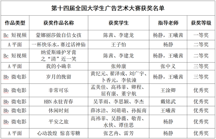 12月15日,第14屆全國大學(xué)生廣告藝術(shù)大賽(以下簡稱“大廣賽”)全國總評審獲獎(jiǎng)名單揭曉,競賽成果展示云盛典在北京成功舉辦。本屆大賽全國共1869所高校踴躍參賽,170萬余名大學(xué)生積極提交創(chuàng)意作品。我校學(xué)子不負(fù)眾望,分別在平面設(shè)計(jì)、微電影廣告視頻、短視頻等賽道中奮勇拼搏,共計(jì)有10項(xiàng)參賽作品榮獲本屆“大廣賽”陜西賽區(qū)大獎(jiǎng),其中一等獎(jiǎng)1項(xiàng)、二等獎(jiǎng)2項(xiàng)、三等獎(jiǎng)2項(xiàng)、優(yōu)秀獎(jiǎng)5項(xiàng),獲獎(jiǎng)總數(shù)再創(chuàng)新高。