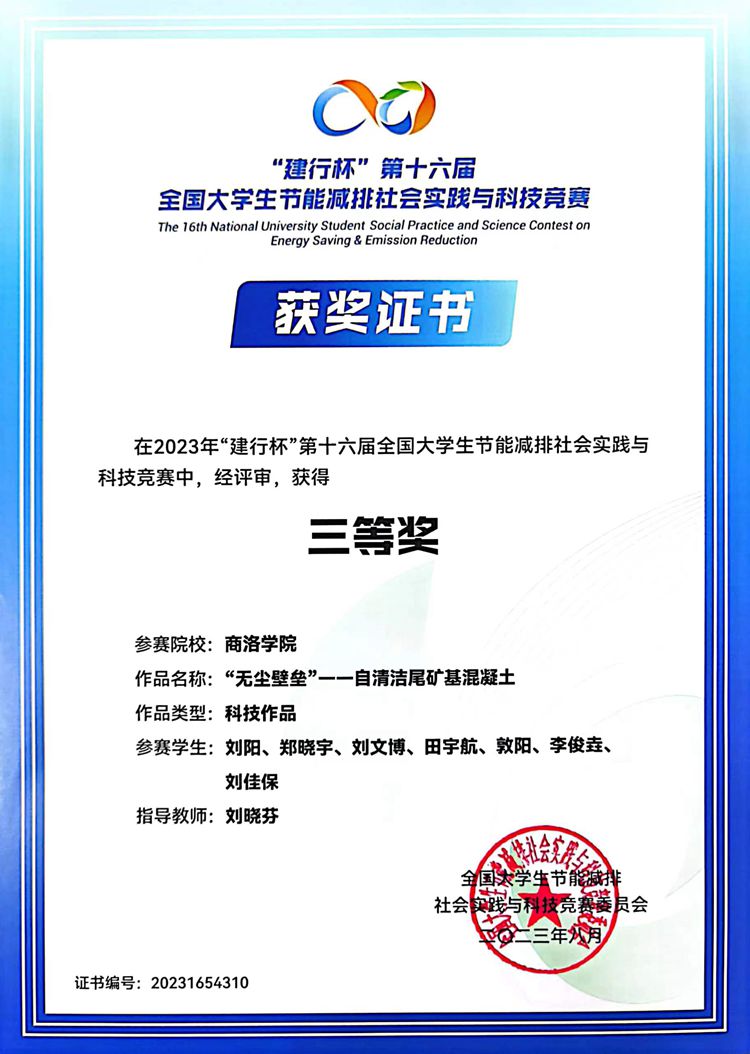 近日,由教育部高等學(xué)校能源動力類專業(yè)教學(xué)指導(dǎo)委員會指導(dǎo),全國大學(xué)生節(jié)能減排社會實(shí)踐與科技競賽委員會主辦的“建行杯”第十六屆全國大學(xué)生節(jié)能減排社會實(shí)踐與科技競賽決賽在東南大學(xué)舉行。經(jīng)過激烈角逐,化材學(xué)院劉曉芬博士指導(dǎo)完成的作品《“無塵壁壘”——自清潔尾礦基混凝土》、陳鳳英教授、趙威副教授聯(lián)合指導(dǎo)完成的作品《能量銀行——尾礦陶?;L鏈酰腙相變復(fù)合材料》從全國近7000件作品中脫穎而出,榮獲國賽三等獎。