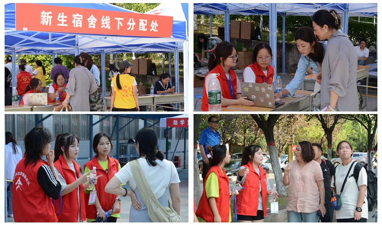 為方便新生入學(xué),學(xué)校在各個(gè)站點(diǎn)設(shè)立了報(bào)到接站處,并在周邊路口安置指引路標(biāo)。在校園內(nèi),醒目的迎新標(biāo)語、熱情的志愿者隨處可見,學(xué)校還設(shè)立了臨時(shí)醫(yī)療服務(wù)區(qū),為新生、家長及工作人員提供及時(shí)的醫(yī)療保障。在各緊要路口設(shè)立志愿服務(wù)區(qū),為新生和家長提供校園指引和飲用水等服務(wù)。在新生報(bào)名處和玉蘭廣場設(shè)立的資格審查、助學(xué)貸款回執(zhí)辦理、學(xué)費(fèi)繳納等接待平臺(tái)前,新生正有序排隊(duì)辦理各項(xiàng)手續(xù),秩序井然。