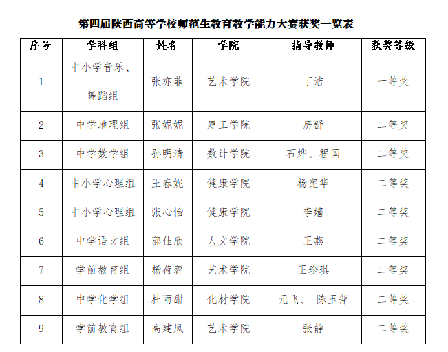 近日,陜西省教育廳公布了第四屆陜西高等學(xué)校師范生教育教學(xué)能力大賽獲獎(jiǎng)名單。我校獲得一等獎(jiǎng)1項(xiàng)、二等獎(jiǎng)8項(xiàng),獲獎(jiǎng)數(shù)量再創(chuàng)新高。