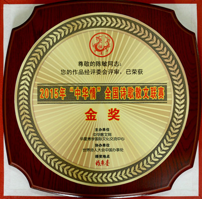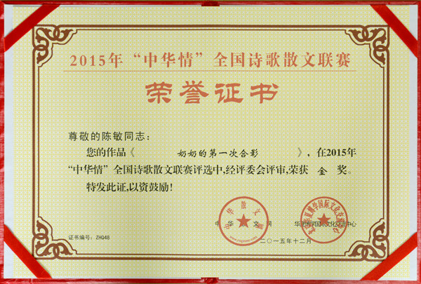 12月5日,2015年“中華情”全國(guó)詩(shī)歌散文聯(lián)賽評(píng)選結(jié)果揭曉,在國(guó)內(nèi)外12085篇參評(píng)作品中,我校語(yǔ)言文化傳播學(xué)院教師陳敏創(chuàng)作的作品《奶奶的第一次合影》最終脫穎而出,榮獲2015年“中華情”全國(guó)詩(shī)歌散文聯(lián)賽金獎(jiǎng)。