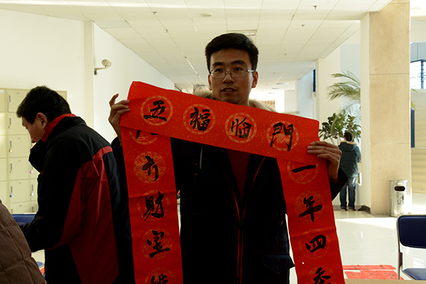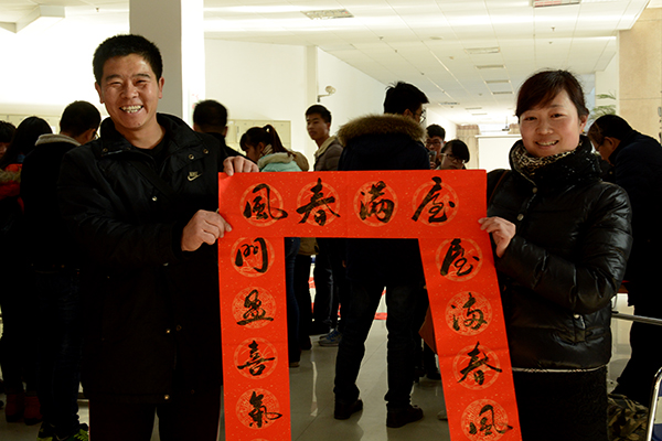 活動(dòng)現(xiàn)場,“五湖四海皆春色 萬水千山盡得輝”、“和順一門有百福 平安二字值千金” 、“綠竹別其三分景 紅梅正報(bào)萬家春”、“壯麗山河多異彩 文明國度遍高風(fēng)”……一張張紅紙上寫滿了新春的祝福語。師生們圍繞在書法家周圍選擇自己心儀的祝福話語,書法家們揮毫潑墨,一一滿足廣大師生的心愿,淡淡的墨香伴著師生幸福的笑臉為校園增添了濃濃的年味。
