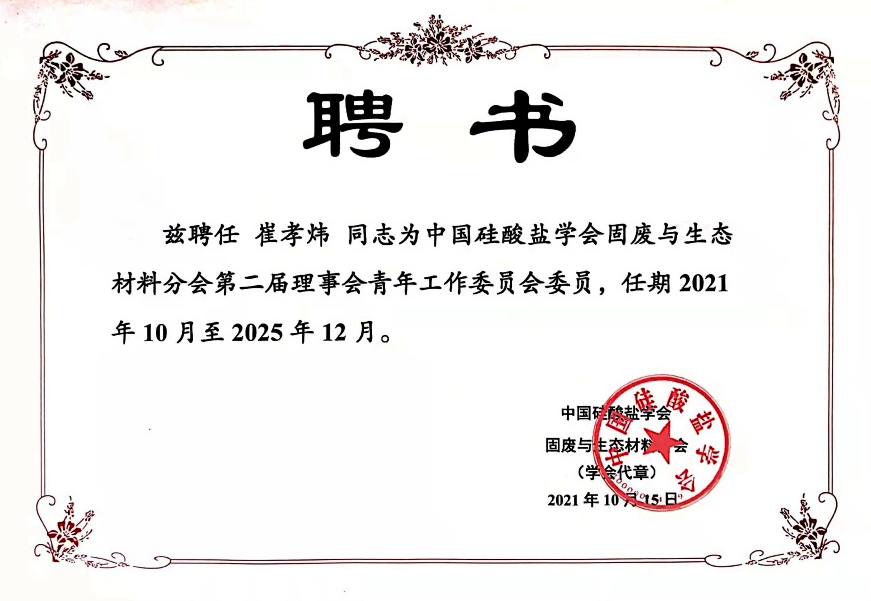 10月15日-17日,第四屆中國固廢處理與生態(tài)材料學(xué)術(shù)與技術(shù)交流會在武漢召開,會議推舉審定了第二屆中國硅酸鹽學(xué)會固廢與生態(tài)材料分會理事會建筑固廢學(xué)術(shù)委員會名單(110名),我?;膶W(xué)院副院長崔孝煒博士受邀線上參會,并在會上被聘為中國硅酸鹽學(xué)會固廢與生態(tài)材料分會第二屆理事會青年工作委員會委員。