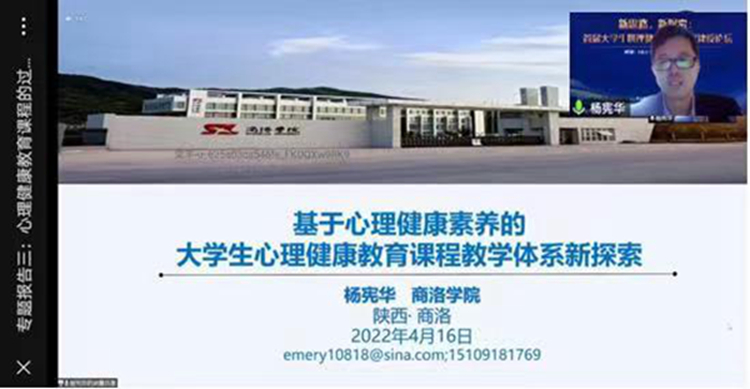 4月16日至17日,中國心理衛(wèi)生協(xié)會大學(xué)生心理咨詢專委會聯(lián)合國家社科基金重大項目“國民心理衛(wèi)生素養(yǎng)及其提升機制與對策”項目組舉辦全國“新思路,新探索:首屆大學(xué)生心理健康教育課程建設(shè)論壇” 線上學(xué)術(shù)論壇,我校健康學(xué)院楊憲華副教授受邀在“專題報告”環(huán)節(jié)作交流發(fā)言。
