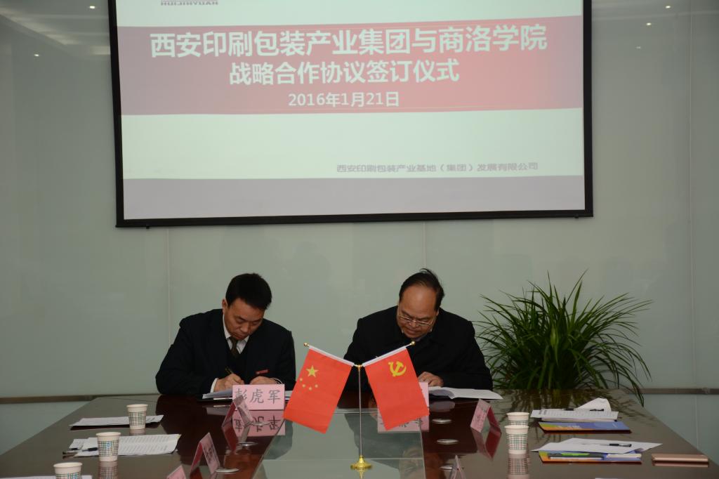 2016年1月21日,我校與西安印刷包裝產(chǎn)業(yè)集團(tuán)在西安經(jīng)濟(jì)技術(shù)開發(fā)區(qū)草灘生態(tài)產(chǎn)業(yè)園簽署戰(zhàn)略合作協(xié)議并舉行授牌儀式。校黨委副書記彭虎軍與西安印刷包裝產(chǎn)業(yè)集團(tuán)董事長袁學(xué)武代表校企雙方在協(xié)議上簽字。彭虎軍在簽約儀式之后向西安印刷包裝產(chǎn)業(yè)集團(tuán)授予“商洛學(xué)院大學(xué)生創(chuàng)新創(chuàng)業(yè)實(shí)踐基地”和“商洛學(xué)院教學(xué)實(shí)踐基地”牌。學(xué)校黨政辦公室、教務(wù)處、學(xué)生處、招生就業(yè)處等部門領(lǐng)導(dǎo),西安印刷包裝產(chǎn)業(yè)集團(tuán)黨總支副書記劉海軍及集團(tuán)有關(guān)部門人員參加了簽約授牌儀式。簽約授牌儀式由劉海軍主持。