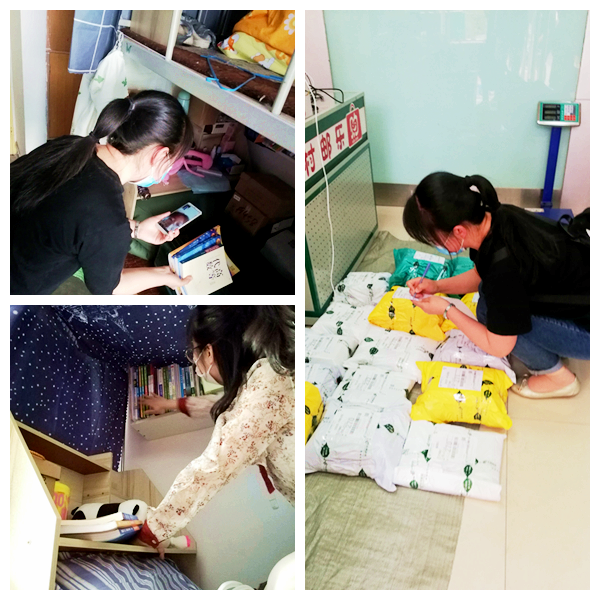 “老師,單位通知我盡快簽約,可我的三方還在宿舍,能不能幫我取一下?”“導(dǎo)員,上學(xué)期高數(shù)(1)好不容易沒有掛科,現(xiàn)在《高數(shù)(2)》快結(jié)課了,要是再沒有書,這學(xué)期肯定掛了,能不能幫幫我!”面對學(xué)生的要求,數(shù)計學(xué)院學(xué)工人員主動變身校園“快遞員”,“云”接單后在學(xué)生宿舍進行直播“帶貨”,小到一張紙,大到筆記本電腦都在他們的下單范圍。“你看看是不是這本書?英語書要不要?”“你的柜子鑰匙在哪里?是在床墊靠門的一邊下面壓著嗎?”“你要拿哪幾件衣服?是這件嗎?還有那件,需要嗎?”“宿舍陽臺的幾盆植物是誰的呀,已經(jīng)干癟了,我給幫忙澆點水。”找到東西后,輔導(dǎo)員們會逐一貼上標(biāo)簽仔細核對,以免物品混淆,到快遞寄送點后也會一直監(jiān)督物品打包、物流信息填寫,還會對個別建檔立卡學(xué)生提供包郵服務(wù)。