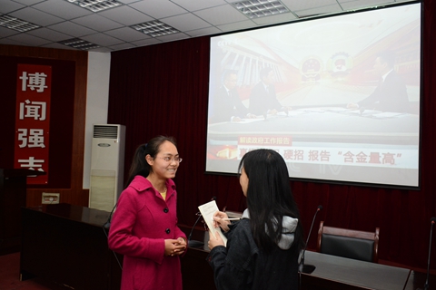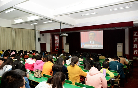 3月3日和3月5日,政協(xié)第十二屆全國(guó)委員會(huì)第五次會(huì)議、十二屆全國(guó)人大五次會(huì)議分別在北京人民大會(huì)堂開(kāi)幕。我校組織師生在報(bào)告廳集中收看了開(kāi)幕式實(shí)況直播,師生們分別通過(guò)手機(jī)、網(wǎng)絡(luò)、電視、廣播等媒體積極收看收聽(tīng),對(duì)兩會(huì)精神、熱點(diǎn)話題進(jìn)行了學(xué)習(xí)討論。