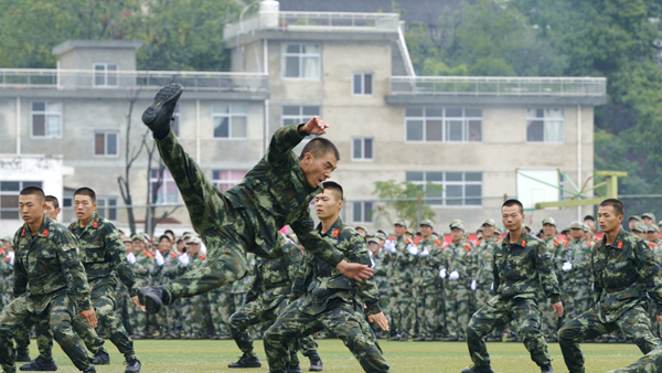 分列式結(jié)束后,軍訓(xùn)教官和學(xué)生進(jìn)行了格斗、匕首操、五步拳匯報(bào)表演。教官們精彩的格斗表演氣勢(shì)威猛如虎、出手灑脫有力,盡展果敢剛強(qiáng)的軍人本色,讓人熱血沸騰;女兵們表演的匕首操動(dòng)作整齊、聲音洪亮,完美詮釋了“巾幗不讓須眉”的豪情壯志;全體參訓(xùn)學(xué)生共同完成的五步拳表演扎實(shí)穩(wěn)健、氣勢(shì)磅礴,展現(xiàn)了我校學(xué)子昂揚(yáng)的青春斗志,引起了現(xiàn)場(chǎng)師生陣陣歡呼與掌聲。
