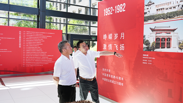 会前Q张志昌、范C、郭瑾一行在中国建筑西北设计研究院有限公司相兌责h的陪同下参观?0周年展厅和绿色能源院?/p>