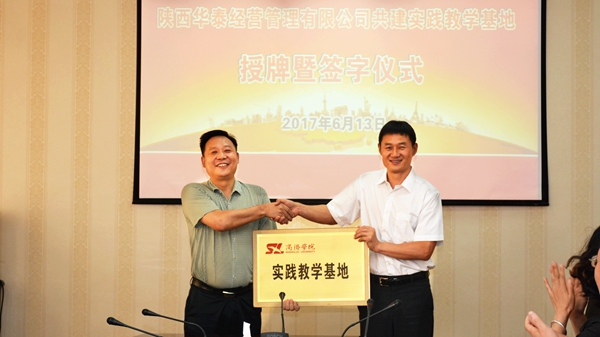 6月13日,我校與陜西華泰經(jīng)營(yíng)管理有限公司共建實(shí)踐教學(xué)基地授牌暨簽字儀式在學(xué)校四樓會(huì)議室舉行。副校長(zhǎng)劉勇向陜西華泰經(jīng)營(yíng)管理有限公司董事長(zhǎng)李仁斌授牌。教務(wù)處處長(zhǎng)李超與陜西華泰經(jīng)營(yíng)管理有限公司總經(jīng)理閆博簽訂合作協(xié)議。儀式由經(jīng)管學(xué)院副院長(zhǎng)王怡主持。經(jīng)管學(xué)院、建工學(xué)院教師代表參加活動(dòng)。