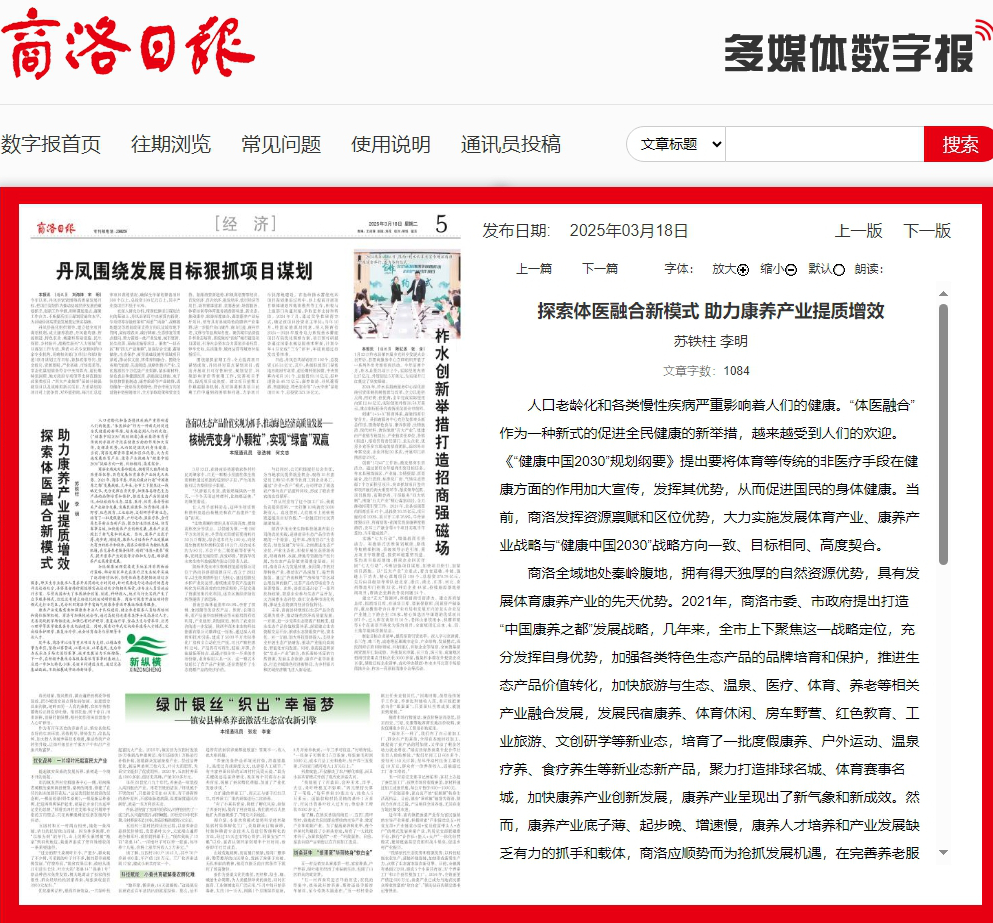 人口老齡化和各類慢性疾病嚴(yán)重影響著人們的健康?!绑w醫(yī)融合”作為一種新式的促進(jìn)全民健康的新舉措,越來越受到人們的歡迎?!丁敖】抵袊?guó)2030”規(guī)劃綱要》提出要將體育等傳統(tǒng)的非醫(yī)療手段在健康方面的作用加大宣傳,發(fā)揮其優(yōu)勢(shì),從而促進(jìn)國(guó)民的身體健康。當(dāng)前,商洛發(fā)揮資源稟賦和區(qū)位優(yōu)勢(shì),大力實(shí)施發(fā)展體育產(chǎn)業(yè)、康養(yǎng)產(chǎn)業(yè)戰(zhàn)略與“健康中國(guó)2030”戰(zhàn)略方向一致、目標(biāo)相同、高度契合。