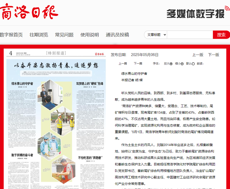 作為黨支部書記,劉璇還將黨建與科研深度融合,以“黨建紅生態(tài)綠 當(dāng)好秦嶺衛(wèi)士”為目標(biāo),帶領(lǐng)團(tuán)隊(duì)開展尾礦建材化、生態(tài)化利用研究,獲批“冶金礦山尾礦高效利用工程技術(shù)研究中心”并聯(lián)合發(fā)起“中國建材工業(yè)經(jīng)濟(jì)研究會(huì)尾礦資源化產(chǎn)業(yè)分會(huì)”,培養(yǎng)出多名省市級科技副總和青年學(xué)者,為行業(yè)輸送大批技術(shù)骨干。研究成果在多家企業(yè)推廣,形成了從基礎(chǔ)研究到產(chǎn)業(yè)落地的完整創(chuàng)新鏈,為秦嶺礦產(chǎn)綠色開發(fā)與生態(tài)保護(hù)提供了理論支撐。