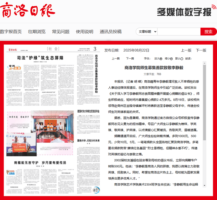 商洛籍青年李靜毅渭河救人不幸犧牲的感人事跡經(jīng)媒體報(bào)道后,在商洛學(xué)院師生中引起廣泛反響。該校發(fā)出《關(guān)于深入學(xué)習(xí)李靜毅同志崇高精神暨開(kāi)展愛(ài)心捐贈(zèng)的倡議書》,師生積極響應(yīng),短時(shí)間內(nèi)募集愛(ài)心捐款2.4萬(wàn)多元。8月19日,該校相關(guān)領(lǐng)導(dǎo)赴商州區(qū)金陵寺鎮(zhèn)崔坪村將善款送至李靜毅父母手中,傳遞全校師生對(duì)英雄家庭的關(guān)懷。