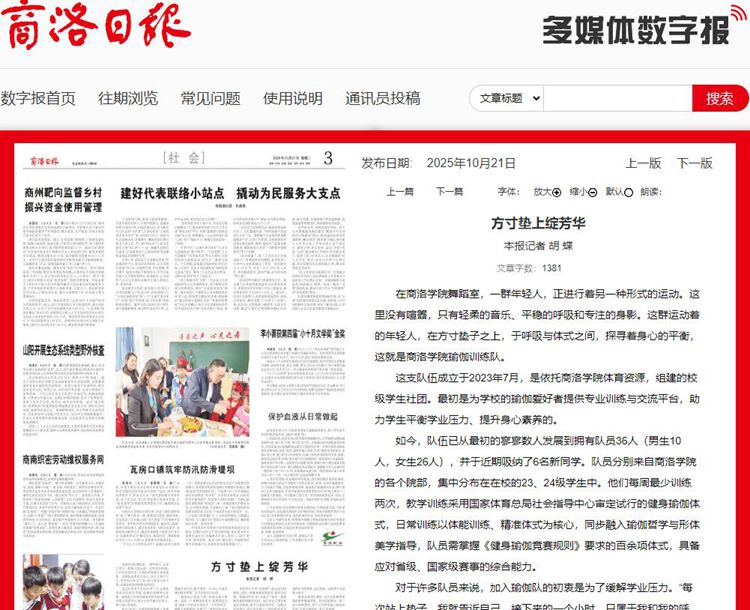 這支隊(duì)伍成立于2023年7月,是依托商洛學(xué)院體育資源,組建的校級(jí)學(xué)生社團(tuán)。最初是為學(xué)校的瑜伽愛好者提供專業(yè)訓(xùn)練與交流平臺(tái),助力學(xué)生平衡學(xué)業(yè)壓力、提升身心素養(yǎng)的。