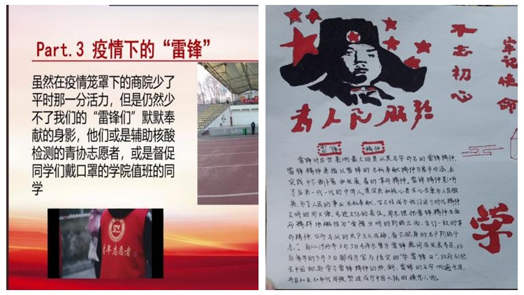 在“教育學(xué)習(xí)”上下功夫,將雷鋒精神注入學(xué)生心靈。學(xué)院通過(guò)微團(tuán)課、主題團(tuán)日活動(dòng)等形式組織廣大學(xué)生圍繞“學(xué)習(xí)雷鋒精神、抗擊疫情我先行”“如何踐行雷鋒精神”等話題開(kāi)展討論;以“讀雷鋒日記、講雷鋒故事、畫(huà)學(xué)習(xí)板報(bào)”為載體,營(yíng)造濃厚的學(xué)習(xí)氛圍,引導(dǎo)學(xué)生深刻領(lǐng)會(huì)雷鋒精神的實(shí)質(zhì)內(nèi)涵。