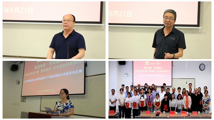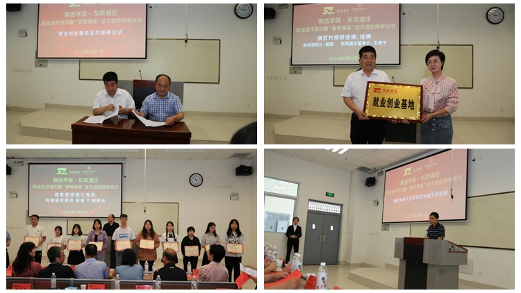 6月21日,人文學(xué)院與陜西東鳳酒莊有限公司共同舉辦校企合作簽約儀式暨“愛(ài)我商洛”征文活動(dòng)頒獎(jiǎng)活動(dòng)?!渡搪迦?qǐng)?bào)社》總編輯南書(shū)堂、商洛市作協(xié)主席魚(yú)在洋、丹鳳縣政府教育督導(dǎo)室主任白寬虎、丹鳳縣科技統(tǒng)籌中心主任李書(shū)軍、丹鳳縣委黨校副校長(zhǎng)程毅飛、商洛學(xué)院科技處處長(zhǎng)程敏、商洛學(xué)院教務(wù)處副處長(zhǎng)李會(huì)榮、陜西東鳳酒莊有限公司總經(jīng)理王青寧、商洛學(xué)院人文學(xué)院全體黨政領(lǐng)導(dǎo)出席。征文活動(dòng)獲獎(jiǎng)?wù)吆蜕搪鍖W(xué)院人文學(xué)院師生代表共一百余人參加了活動(dòng)?;顒?dòng)由人文學(xué)院副院長(zhǎng)馬英群主持。